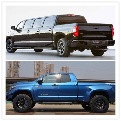 其中丰田坦途就是皮卡系列里面非常耀眼的一颗明珠。虽然坦途在定位上属于是高端皮卡。但是皮卡外观确实有点差强人意。结果丰田就励精图治居然做出来了一个拥有八个车门,车体长约为八米的高端大气皮卡。可以说在皮卡界是绝无仅有的。皮卡的名字叫Tundrasine。虽然说皮卡的名字并不好记,但是我们只要看一眼它的外形。就能想起来和它非常近似的加长林肯。