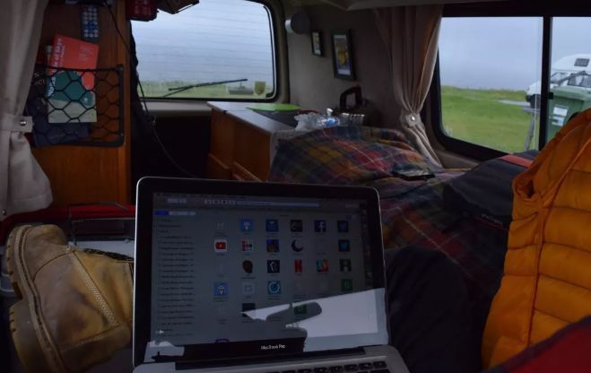 而车内不仅可以吃饭,当把餐桌折叠起来后,就形成了两张单人床,在车上过夜丝毫不成问题。 不过,天气好的时候,他们会在外面支起帐篷,数着天上的星星入眠。