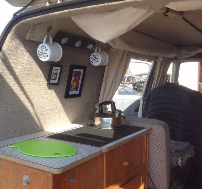 麻省虽小,五脏俱全,再小的房车,也要有个像样的厨房。 砧板下面是水槽,废水从车底排出,还装了一个电动水龙头,旁边是炊具,有一个双灶头的燃气灶。