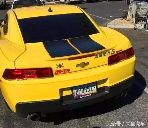 雪佛兰大黄蜂,美式肌肉跑车,车主也贴了“五菱宏光S”标志,不知道即将上映的变形金刚,大黄蜂会不会也带上五菱宏光呢?